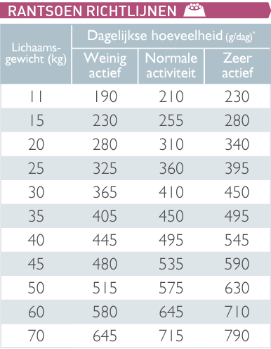 *Deze hoeveelheden zijn bij benadering en kunnen variëren afhankelijk van het hondenras en de hoeveelheid lichaamsbeweging. Raadpleeg je dierenarts of dierenartsassistente voor meer informatie.