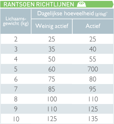 * Deze hoeveelheden zijn indicatief en kunnen variëren afhankelijk van het ras van de kat. Raadpleeg je dierenarts of dierenartsassistente voor meer informatie.