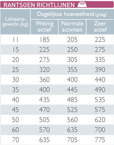 *Deze hoeveelheden zijn slechts richtwaarden en kunnen varierën naargelang het ras en de activiteit van de hond.