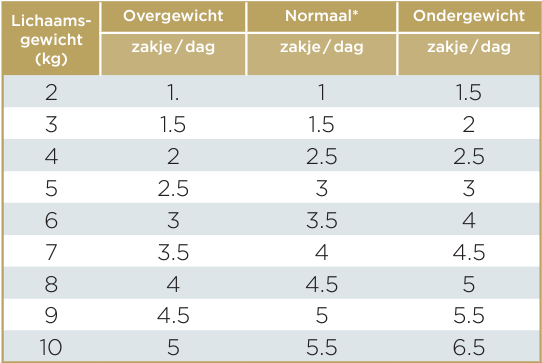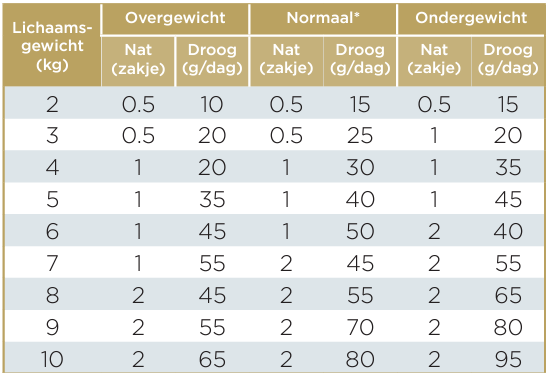 Het dagelijkse rantsoen is gebaseerd op het HUIDIGE gewicht van de kat en dient elke maand aangepast te worden. Zorg altijd voor voldoende vers drinkwater.