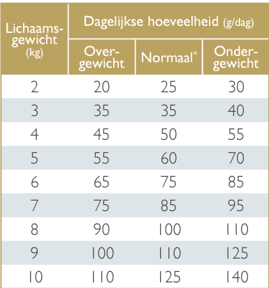 De dagelijkse hoeveelheid is gebaseerd op het huidige lichaamsgewicht van de kat en moet elke maand worden aangepast. Zorg altijd voor een ruime hoeveelheid vers drinkwater.