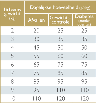 De dagelijkse hoeveelheid is gebaseerd op het HUIDIGE lichaamsgewicht van de kat en moet elke week worden aangepast in geval van gewichtsverlies en elke maand om op gewicht te blijven.
