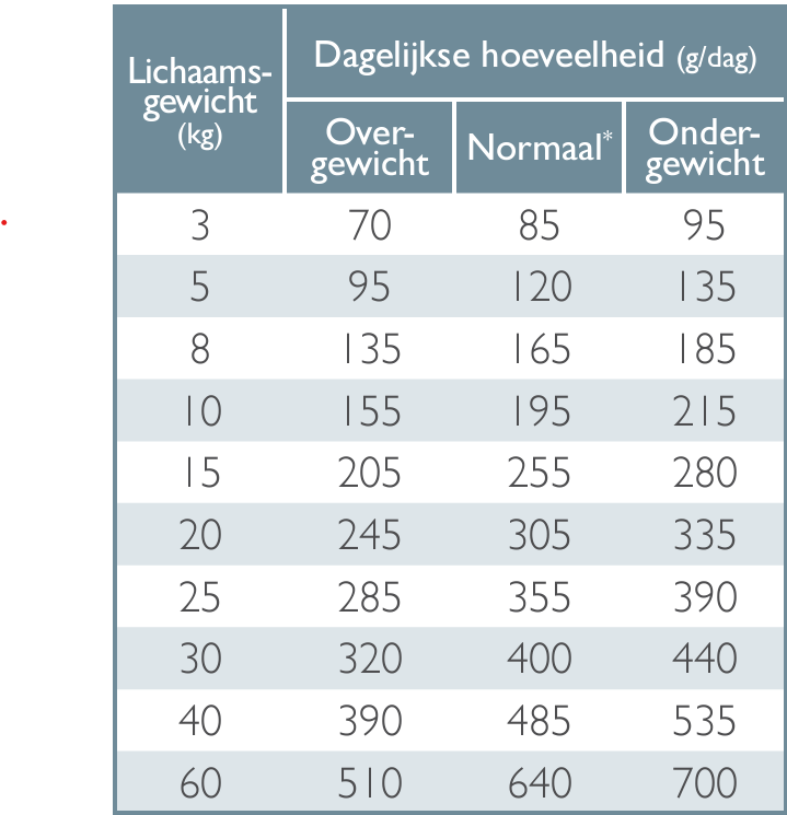 Het dagelijkse rantsoen is gebaseerd op het HUIDIGE lichaamsgewicht van de hond en moet elke maand worden aangepast.