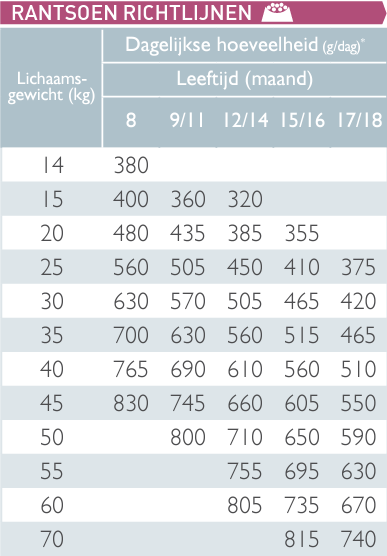 *Deze hoeveelheden zijn bij benadering en kunnen variëren afhankelijk van het ras en de hoeveelheid lichaamsbeweging van de jonge hond. Raadpleeg je dierenarts of dierenartsassistente voor meer informatie.