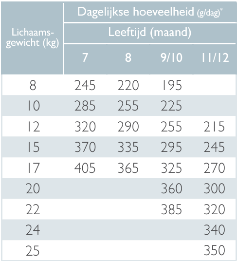 *Deze hoeveelheden zijn bij benadering en kunnen variëren afhankelijk van het ras en de hoeveelheid lichaamsbeweging van de jonge hond. Raadpleeg je dierenarts of dierenartsassistente voor meer informatie.