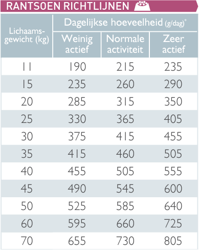 *Deze hoeveelheden zijn bij benadering en kunnen variëren afhankelijk van het hondenras en de hoeveelheid lichaamsbeweging. Raadpleeg je dierenarts of dierenartsassistente voor meer informatie.